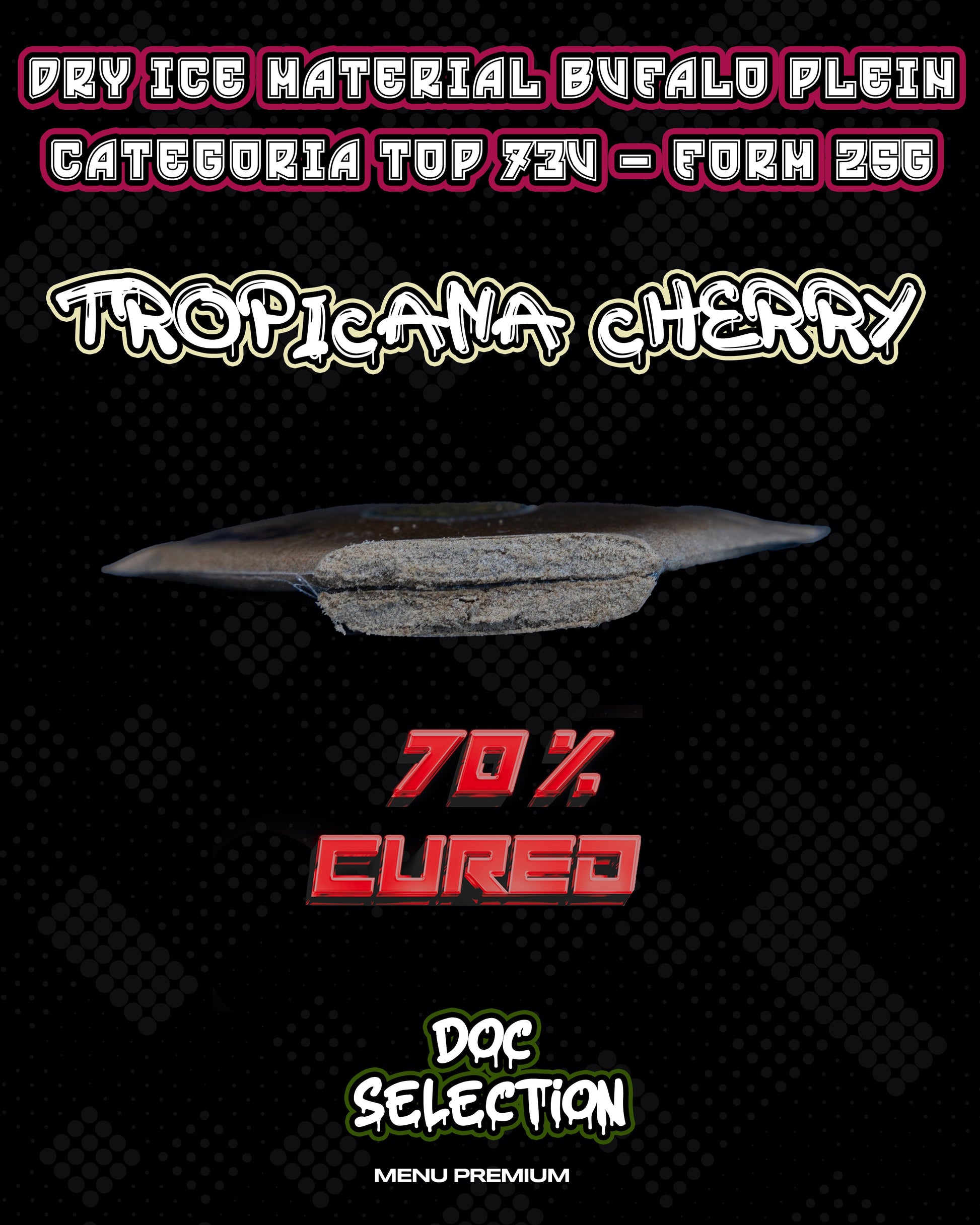 Aspetto e Aroma - Il Dry Ice Material di Bufalo Plein, derivato dallo strain Tropicana Cherry, rappresenta il top di gamma dei nostri ICE DRY . Questo prodotto si presenta con una consistenza incredibilmente pulita, secca e friabile, ottenuta grazie a un processo di estrazione a freddo di altissimo livello, che garantisce una purezza superiore. Il concentrato sfoggia una colorazione brillante e traslucida. Il profilo aromatico รจ un tripudio tropicale: intensi sentori di frutta esotica si fondono con il caratteristico aroma di ciliegia matura, arricchito da leggere sfumature agrumate che conferiscono un tocco vivace e rinfrescante.